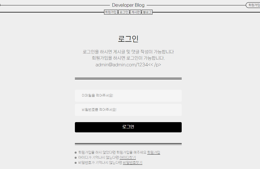 <p>로그인을 하시면 게시글 및 댓글 작성이 가능합니다<br>회원가입을 하시면 로그인이 가능합니다.<br>admin@admin.com/1234<< /p>